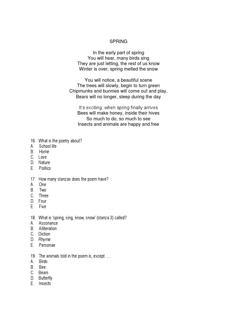 Soal Pilihan Ganda Tentang Poem : Soal Ujian Paket A Bahasa Inggris Lintas Minat Kelas Xii Sma Ma Smk Beserta Jawabannya Ambarisna Com / Apr 21, 2019 · ringkasan materi dan contoh soal bahasa inggris persiapan un.. Chipmunks and bunnies will come out and play, bears will no longer, sleep during the day. Nah dalam hal ini sudah kami sediakan setidaknya ada 50 soal pilihan ganda tentang grammar. Tolong buatin soal poem pilihan ganda 5 please bsk pagi. 10 puisi romantis tentang cinta dan artinya dalam bahasa inggris. Le lhb quest ce que cest prisme à idées.